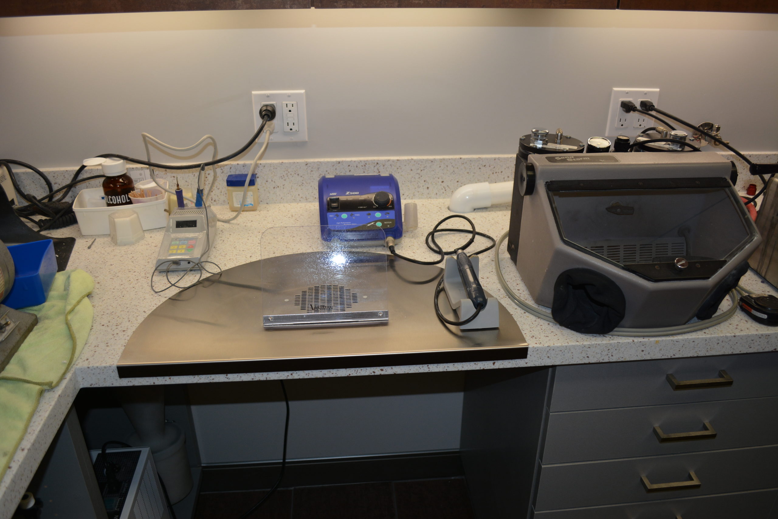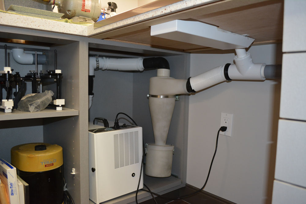When building his new office Dr. Bayette was working with an interior decorator to get the look and feel that he wanted while incorporating an organized, compact, and aesthetically pleasing in house dental lab. He wanted a one station set up where he could do lathe work, grinding, and micro abrasive sand blasting as opposed to a full service dental lab.