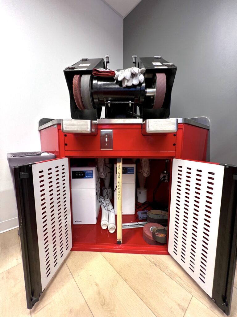 And beyond even that, there’s the matter of presentation. Titleist’s metal shop is as pristine and presentable as the rest of the facility. Rows of beautiful cherry-red cabinets above and below line each wall, corner to corner, looked over by a large high-def television screen and a large gleaming cast of their logo. It’s not a room for customers to necessarily hang out in, but it still has to carry the Titleist standard. Nobody wants dust piling up.