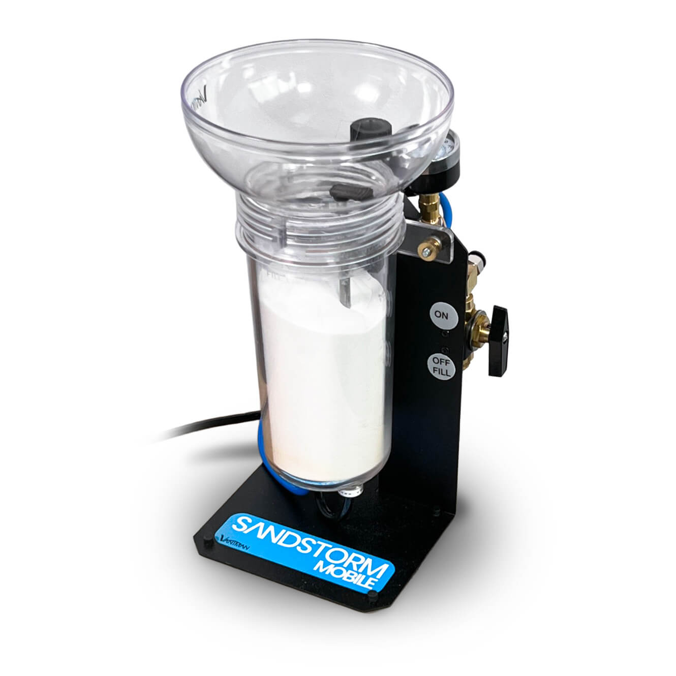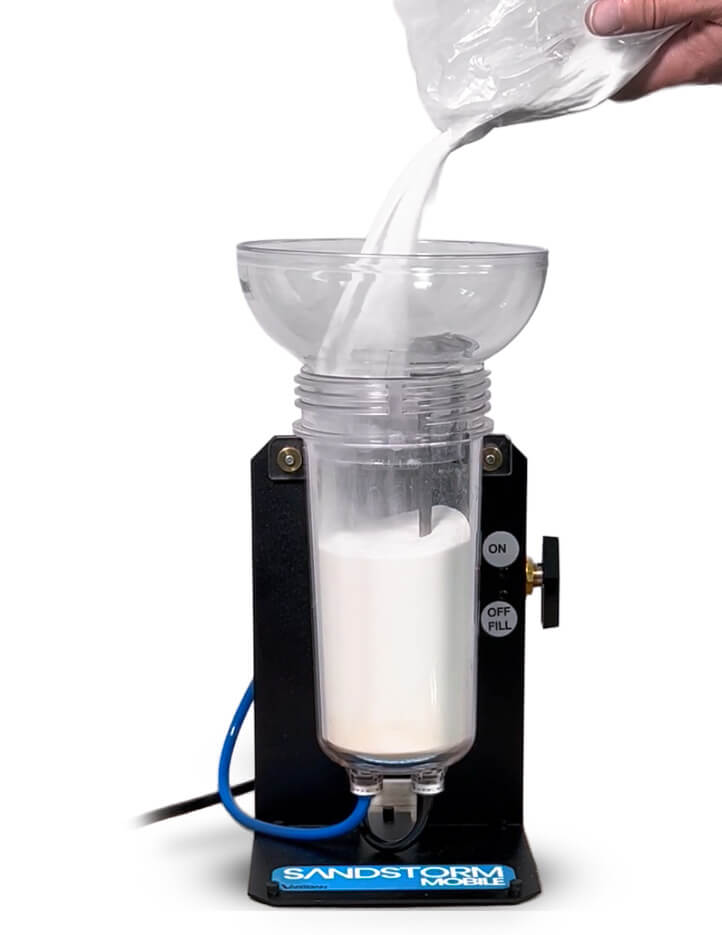 - Ensure sandblaster is in “off” mode (for I/O or “Master” variants), or ensure air line to tank is off. Do not attempt to open tank lid while pressurized.